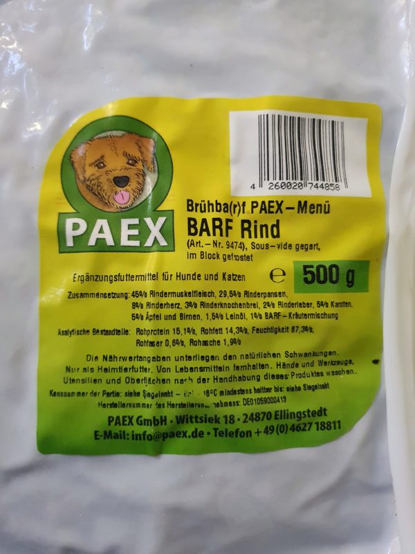 Paex Menü Rind als haltbare Brühvariante. Das Fleisch ist gebrüht, nicht mehr roh.